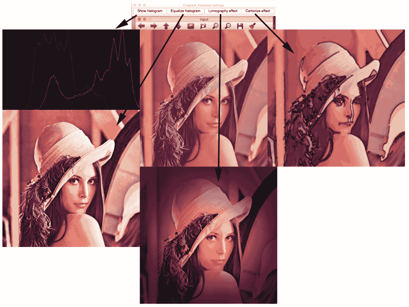 在本章中,我们了解了如何创建一个完整的项目,通过应用不同的效果来处理图像。 我们还将彩色图像分割成多个矩阵,以便仅将效果应用于一个通道。 我们了解了如何创建查找表、如何将多个矩阵合并为一个、如何使用Canny和bilateral过滤器、如何绘制圆以及如何将图像相乘以获得光晕效果。