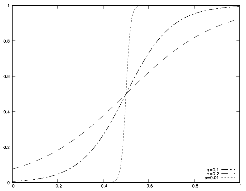 此公式生成一条使暗值更暗、亮值更亮的曲线,其中x是可能的像素值(0到255),s是我们在示例中设置为0.1的常量。 较低的常量值生成的值低于128的像素非常暗,高于128的像素非常亮。 接近1的值将曲线转换为直线,并且不会产生我们想要的效果: