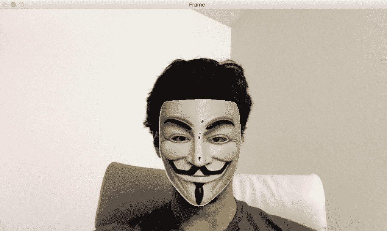 OpenCV 提供了一个很好的人脸检测框架。 我们只需要加载级联文件,并使用它来检测图像中的人脸。 当我们从网络摄像头捕捉到视频流时,我们可以将滑稽的面具覆盖在我们的脸上。 它看起来如下所示: