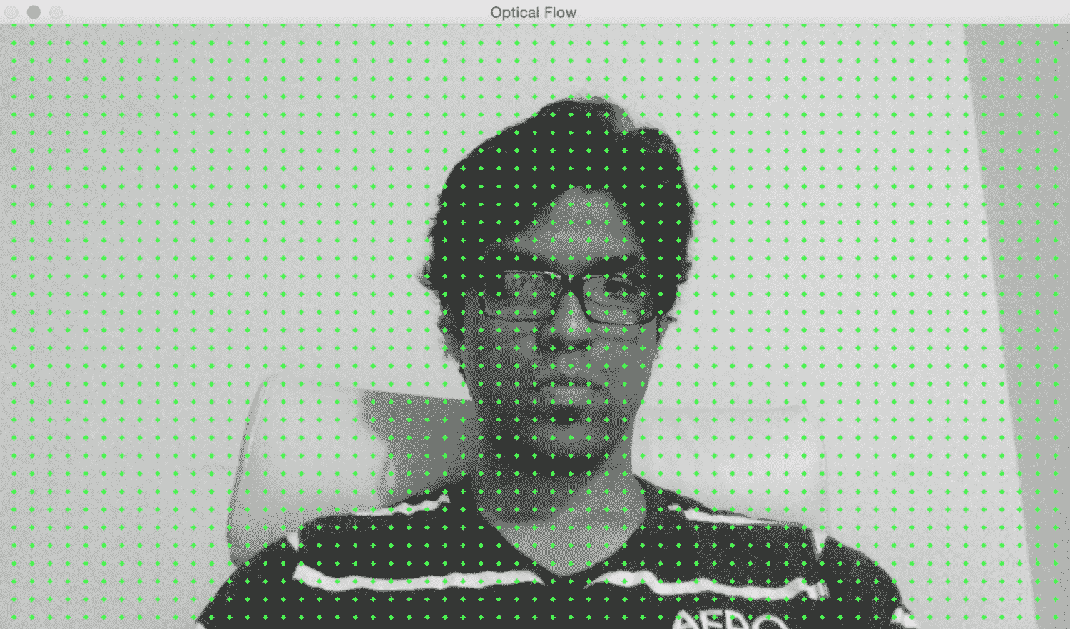 我们使用当前图像和前一图像来计算光流信息。 不用说,输出的质量将取决于所选择的参数。 有关参数的更多详细信息,请访问http://docs.opencv.org/2.4/modules/video/doc/motion_analysis_and_object_tracking.html#calcopticalflowpyrlk。 为了提高质量和健壮性,我们需要过滤掉彼此非常接近的点,因为它们不会添加新的信息。 让我们继续这样做: