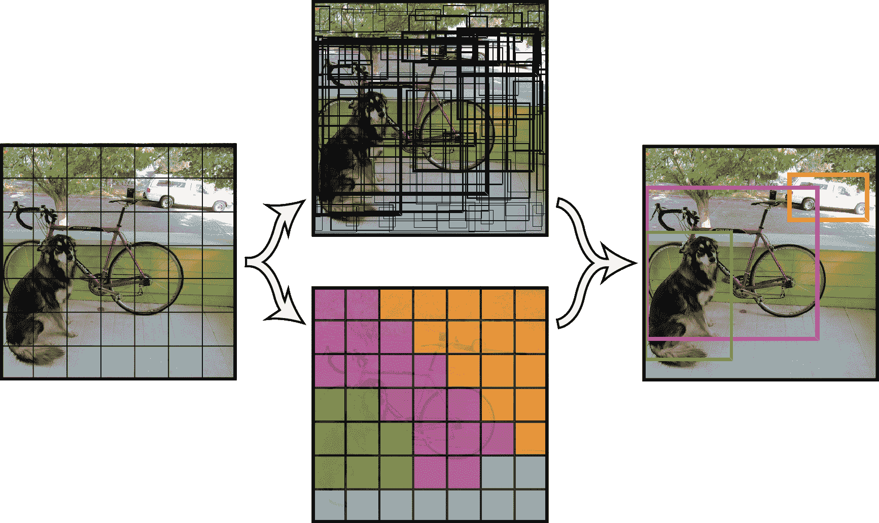 YOLO 使用了一种不同的方法,将图表划分为 S x S 网格。 对于每个网格,YOLO 检查 B 个边界框,然后深度学习模型提取每个面片的边界框、包含可能对象的置信度以及每个框的训练数据集中每个类别的置信度。 以下屏幕截图显示了 S x S 网格: