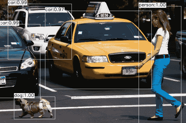 在mat输出向量中,我们有神经网络检测到的所有边界框,我们必须对输出进行后处理,以仅获得置信度大于阈值(通常为 0.5)的结果,最后应用非最大值抑制来消除多余的重叠框。 您可以在 GitHub 上获得完整的后处理代码。