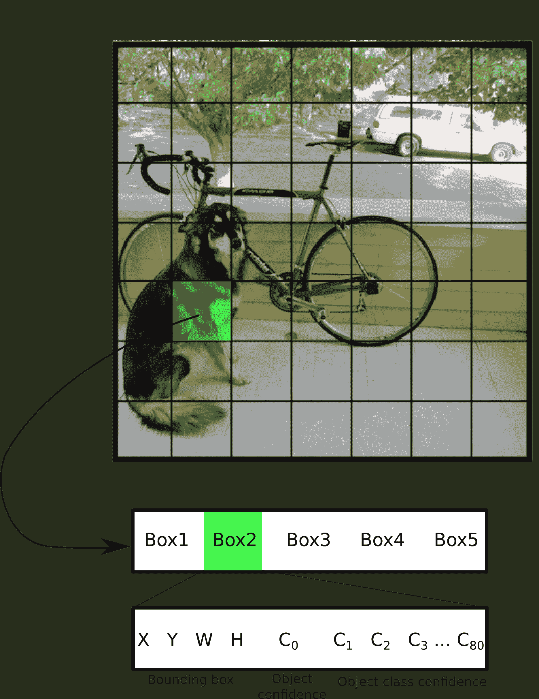 YOLO 使用包含 19 个和 5 个边界框的网格进行训练,每个网格使用 80 个类别。 然后,输出结果为 19x19x425,其中 425 来自边界框(x,y,宽,高)、对象置信度和 80 个类别的数据,置信度乘以每个网格的框数; 5_ 边界框(x,y,w,h,对象_置信度, 分类_置信度[80])=5(4+1+80):