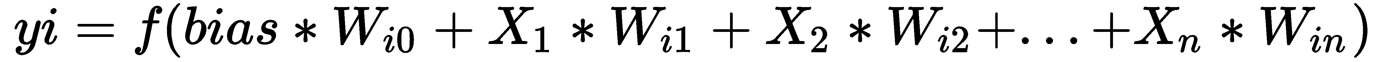 正如我们所看到的,对于每个神经元i,我们数学地将前一个神经元的所有输出(即神经元i(x1,x2...)的输出按权重(wi1,wi2...)相加。)。 加上偏置值,结果是激活函数的自变量f。 最终结果是i神经元的输出:
