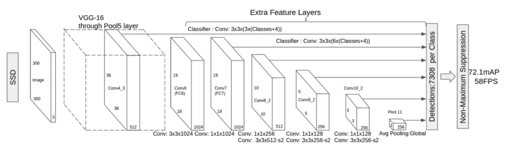 SSD 算法被称为单镜头算法,因为它在处理同一深度学习模型中的图像时同时预测边界框和类别。 基本上,架构概括为以下几个步骤: