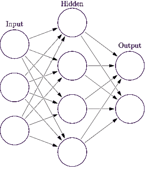 这个网络是分层分布的,每一层都包含许多神经元,这些神经元与前一层的所有神经元相连。 它总是有一个输入层和一个输出层,输入层通常由描述输入图像或数据的要素组成,输出层通常由分类结果组成。 其他中间层称为隐藏层。 下图显示了一个基本的三层神经网络,其中输入层包含三个神经元,输出层包含两个神经元,一个隐藏层包含四个神经元: