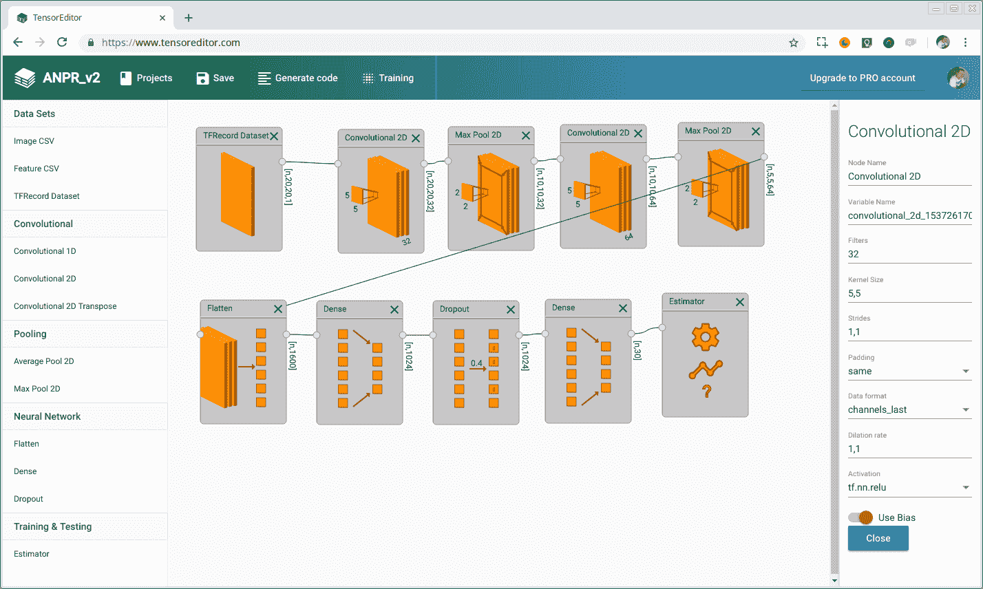 然后,如果要创建新的深度学习模型以在 OpenCV 中使用,首先必须使用 TensorFlow、Caffe、Torch 或 Dark Net 框架或可用于以开放式神经网络交换(ONX)格式导出模型的框架来创建和训练该模型。 使用此框架创建模型可能很简单,也可能很复杂,具体取决于您使用的框架,但本质上您必须堆叠多个层,就像我们在上一个图表中所做的那样,设置 DNN 所需的参数和功能。 现在有其他工具可以帮助您在不编码的情况下创建模型,例如https://www.tensoreditor.com或Lobe.ai。 TensorEditor 允许您下载从可视化设计架构生成的 TensorFlow 代码,以便在您的计算机或云中进行训练。 在下面的屏幕截图中,我们可以看到 TensorEditor: