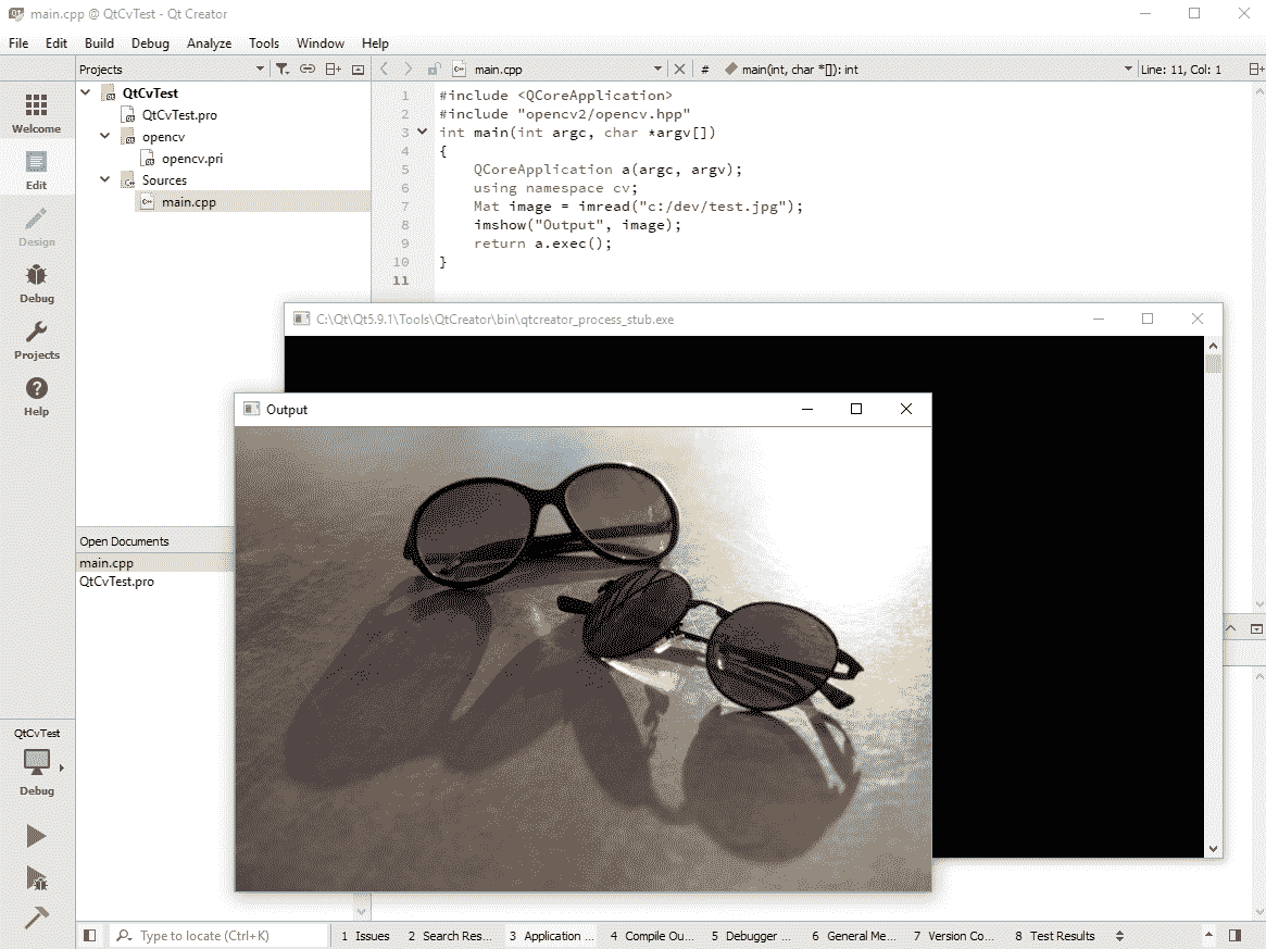 最糟糕的时刻已经过去,我们现在准备深入研究计算机视觉世界,并开始使用 Qt 和 OpenCV 构建令人兴奋的应用。 尽管最后一步称为“测试 OpenCV”,但实际上它是您将要编写的第一个 Qt + OpenCV 应用,就像乍看起来一样简单。 在本节中,我们的目的不是打扰任何事情的工作方式以及幕后发生的事情,而只是确保我们正确地配置了所有内容,并避免在本书后面的内容中浪费与配置相关的问题。 如果您已按照说明进行了所有操作并以正确的顺序执行了所有指令,那么到现在为止,您不必担心任何事情,但是最好验证,这就是我们现在要做的。