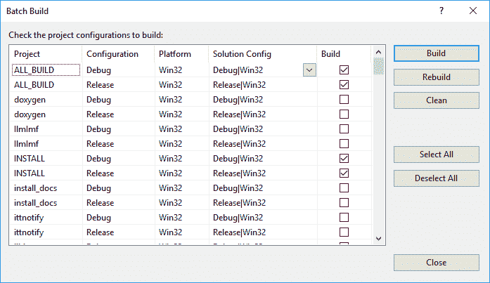 确保在Build列中为ALL_BUILDINSTALL启用了复选框,如以下屏幕截图所示: