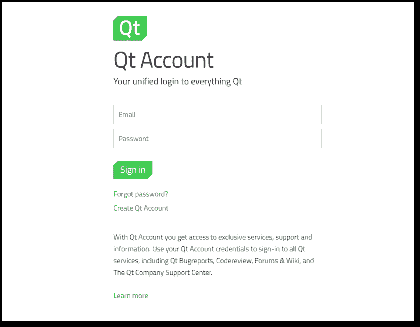 如果您的应用没有出现,请确保再次阅读说明。 另外,请确保没有任何冲突的 Qt 安装或其他可能干扰 Qt 安装的设置。 有关 Qt Creator 或其他 Qt 工具意外行为的答案,请始终参考文档页面和 Qt 社区。 长期以来,Qt 一直是一个开源项目,它已经成长为庞大而忠实的用户群体,他们渴望在互联网上分享他们的知识并回答 Qt 同行用户面临的问题。 因此,密切关注 Qt 社区是个好主意,因为您已经拥有可用于访问 Qt 论坛的统一 Qt 帐户。 这是您为继续进行 Qt 安装过程而创建的用户名和密码。