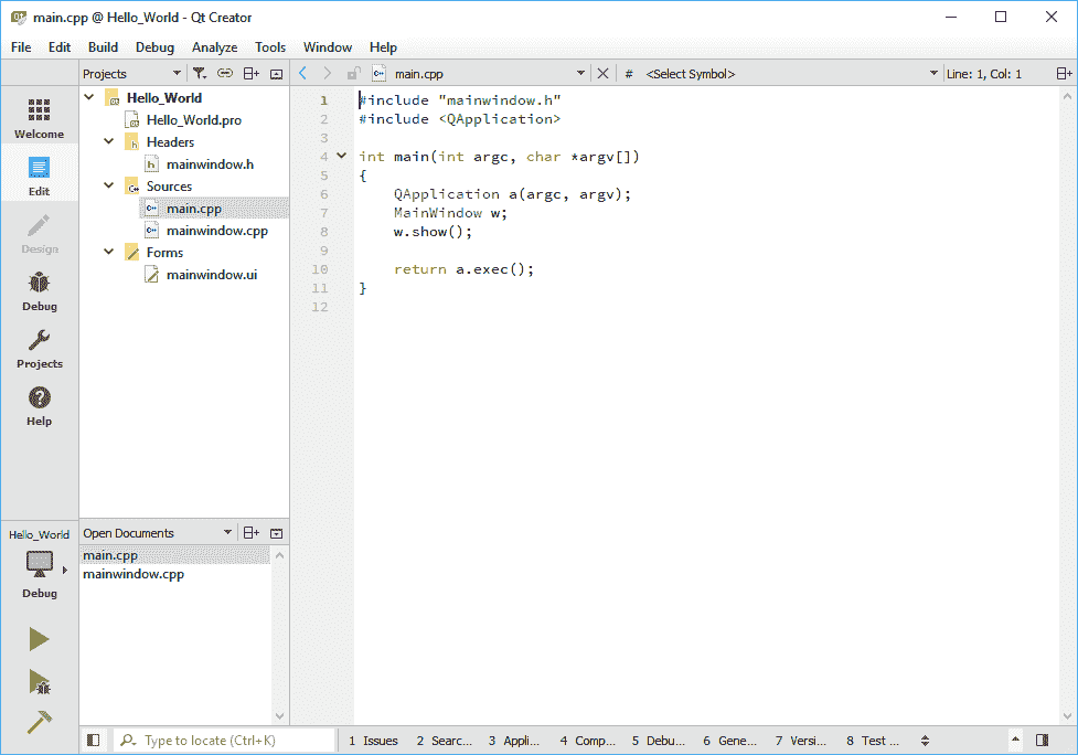 以下是 Qt Creator 的屏幕截图,显示了处于代码编辑模式的 IDE。 在下一章中将介绍有关如何使用 Qt Creator 的详细信息,尽管我们也将在本章稍后的部分中尝试一些测试,而无需过多介绍: