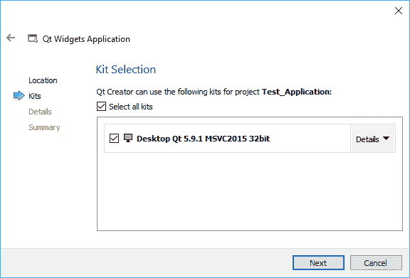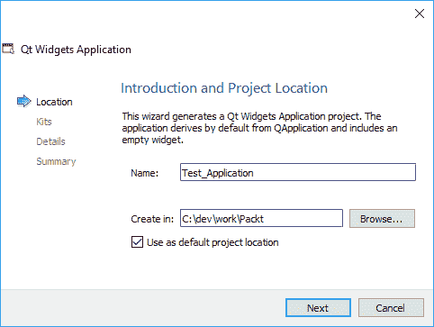 在下一个窗口中,您需要提供一个名称和文件夹(将在其中创建测试项目),然后单击“下一步”继续。 如果要为 Qt 项目使用专用文件夹,请确保选中“用作默认项目位置”复选框。 您只需执行一次,然后所有项目将在该文件夹中创建。 现在,我们只需要输入名称和路径,因为我们仅要测试 Qt 安装,然后单击“下一步”。 您将看到与以下屏幕快照类似的内容: