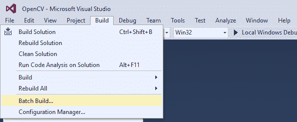 打开 Visual Studio 之后,需要从 Visual Studio 主菜单中选择“批量生成”。 就在Build下: