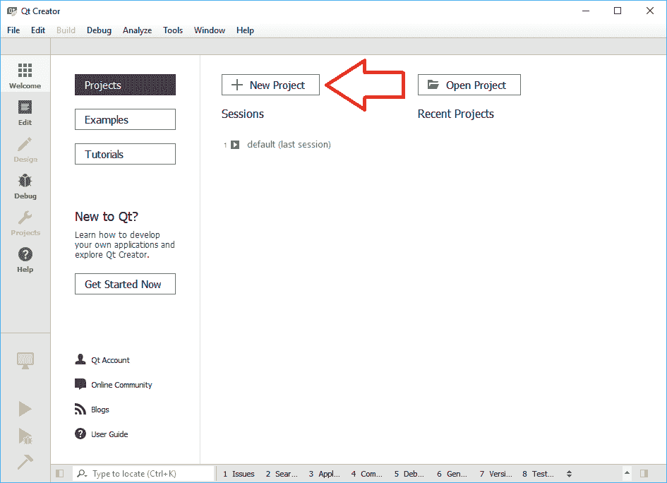 您现在可以安全地运行 Qt Creator 并使用它创建出色的应用。 现在,让我们确保我们的 Qt 安装正确运行。 现在就不用理会细节了,因为我们将在本书的过程中介绍所有细节,尤其是如果您认为自己不了解幕后的真实情况,请不要担心。 只需运行 Qt Creator 并按下显示的大New Project按钮,如下所示: