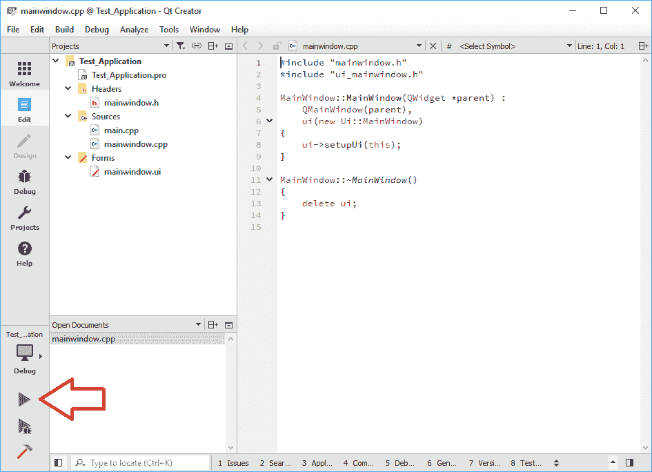 在最后一个窗口上单击“完成”按钮后,您将进入 Qt Creator 中的“编辑”模式。 我们将在下一章介绍 Qt Creator 的不同方面,因此,现在,只需单击“运行”按钮(或按Ctrl + R)即可开始编译(并清空)您的测试应用,如下所示: