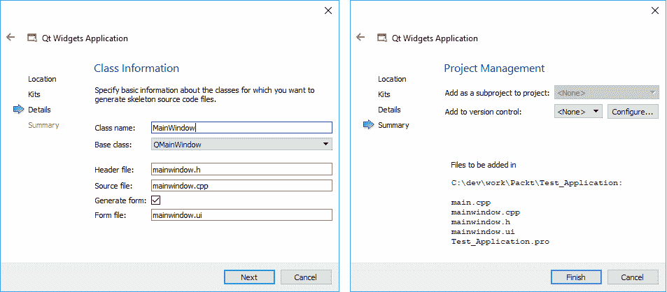 您真的不需要麻烦接下来出现的两个窗口,只需单击“下一步”就足以测试我们的 Qt 安装。 第一个窗口使创建新类更加容易,第二个窗口使您可以选择版本控制工具并跟踪代码中的更改: