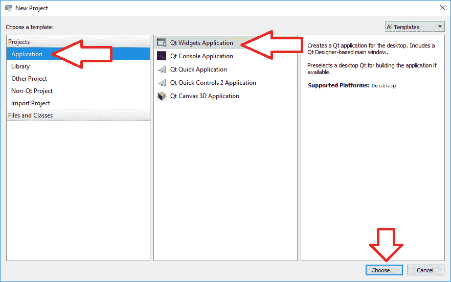 在接下来出现的窗口中,选择“应用”,“Qt Widgets 应用”,然后单击“选择”,如以下屏幕截图所示: