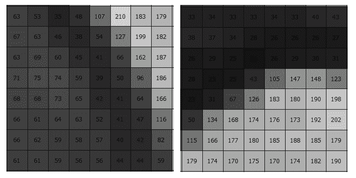在前面的章节中,您非常简要地体验了 OpenCV 框架的Mat类,但是现在我们将更深入地进行研究。 从矩阵中借用其名称的Mat类是n维数组,能够在单个或多个通道中存储和处理不同的数学数据类型。 为了进一步简化,让我们看一下计算机视觉中的图像。 计算机视觉中的图像是像素矩阵(因此为二维数组),具有指定的宽度(矩阵中的列数)和高度(矩阵中的行数)。 此外,灰度图像中的像素可以用一个数字(因此是单个通道)表示,最小值(通常为 0)表示黑色,而最大值(通常为 255)是一个字节可能出现的最大值 )代表白色,而介于两者之间的所有值则对应于不同的灰色强度。 请看以下示例图像,它们只是较大的灰度图像的放大部分。 每个像素都标记有我们刚才提到的强度值: