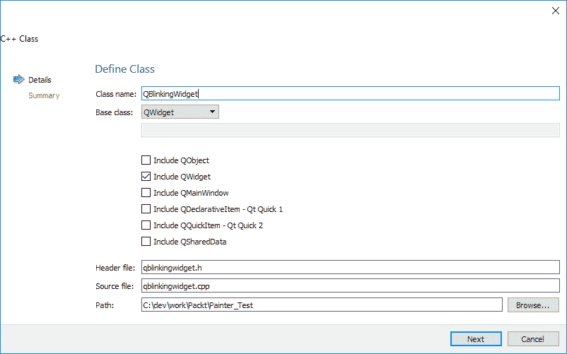 4. 在出现的窗口中,确保将“类名”设置为QBlinkingWidget,并将“基类”选择为QWidget。 确保选中“包括QWidget”复选框,并保留其余选项,如以下屏幕截图所示: