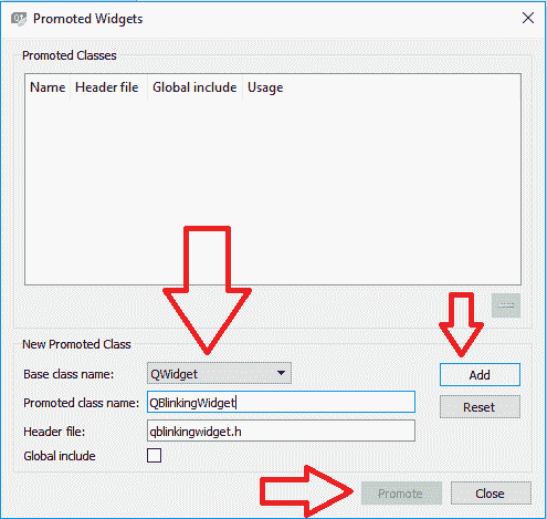 1. 在将打开的新窗口中,称为Promoted Widgets窗口,将Promoted类名设置为QBlinkingWidget,然后按Add按钮:
