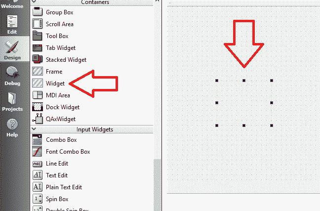 1. 现在,通过打开mainwindow.ui切换到设计模式,然后将小部件添加到MainWindow类。 Widget的确切含义是Widget,它是一个空的,当您将其添加到MainWindow时会注意到。 请参见以下屏幕截图: