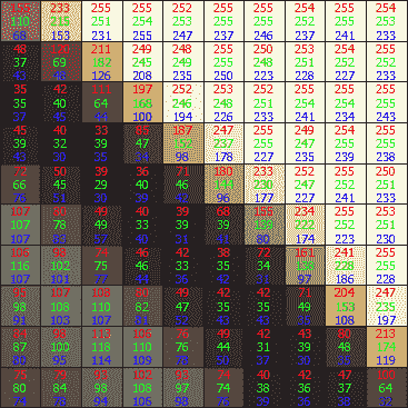 这是上一个示例图片中放大的区域的另一种表示形式。 每个像素都标有基础的红色,绿色和蓝色值:
