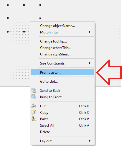 1. 现在,右键单击添加的QWidget类的空窗口小部件,然后从弹出菜单中选择“升级到”:
