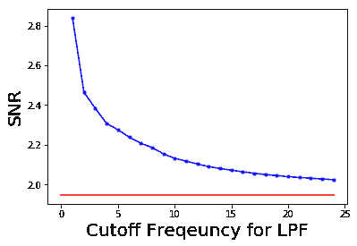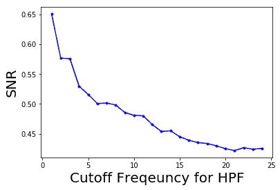 下面的代码块显示了如何用 HPF 的截止频率(F)绘制信噪比(信噪比的变化: