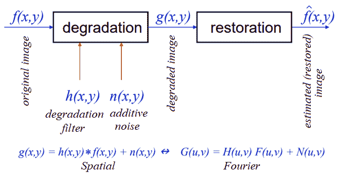 在图像恢复中,对退化进行建模。这可以(很大程度上)消除降解的影响。挑战在于信息和噪音的丢失。下图显示了基本图像退化模型:
