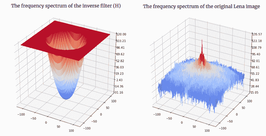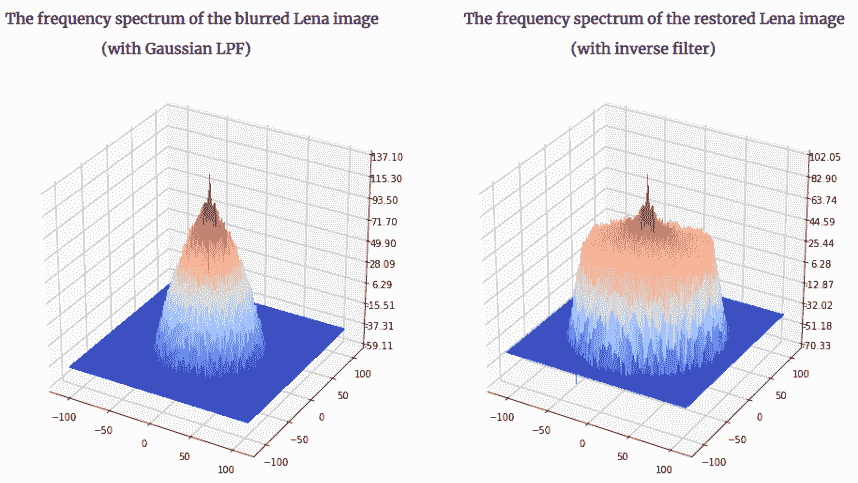 mpl_toolkits.mplot3d模块在 3D 中绘制图像、高斯核和频域卷积后获得的图像的频谱(输出应类似于各部分所示的表面)。(提示:np.meshgrid()功能将在surface绘图中派上用场)。对反向过滤器也重复此练习。 - 向