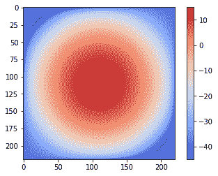 pylab.imshow( (20*np.log10( 0.01 + fp.fftshift(freq_kernel))).real.astype(int), cmap='coolwarm') # 0.01 is added to keep the argument to log function always positive