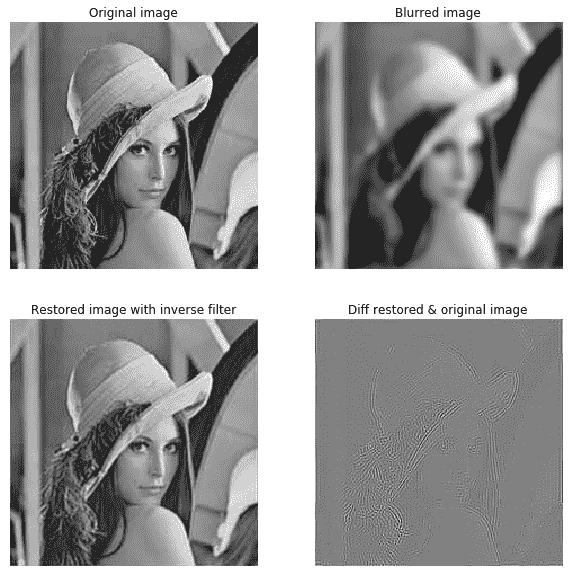 lena图像添加一些随机噪声,用高斯核模糊图像,然后尝试使用逆滤波器恢复图像,如相应示例所示。发生了什么,为什么? - 使用 SciPy 信号的
