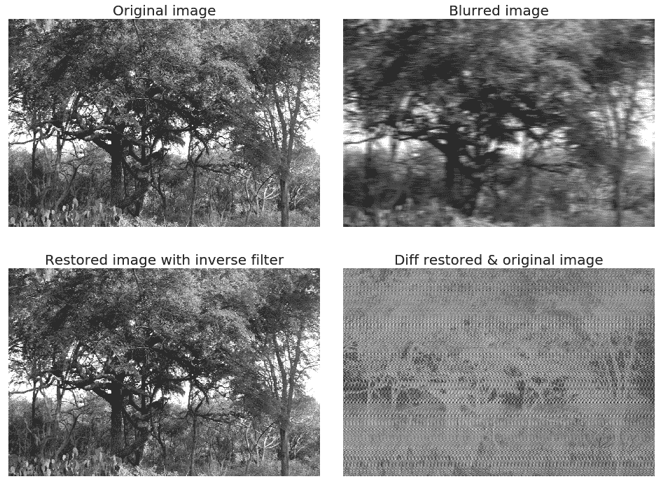现在我们可以对模糊图像使用逆滤波器(使用相同的H)来恢复原始图像。以下代码块演示了如何执行此操作: