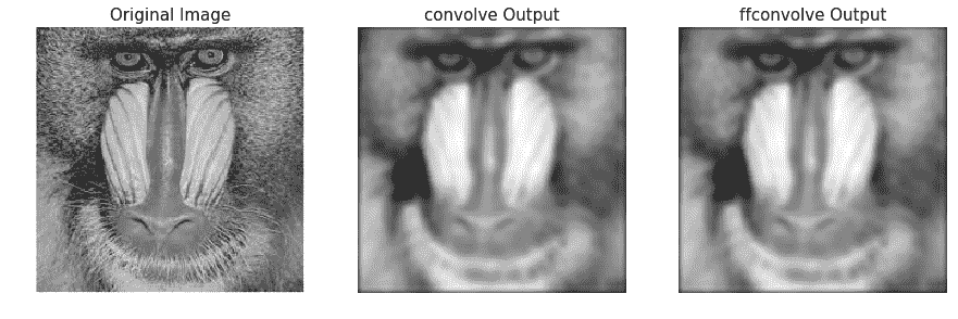 pylab.subplot(133), pylab.imshow(im_blurred2), pylab.title('ffconvolve Output', size=15),pylab.axis('off')
