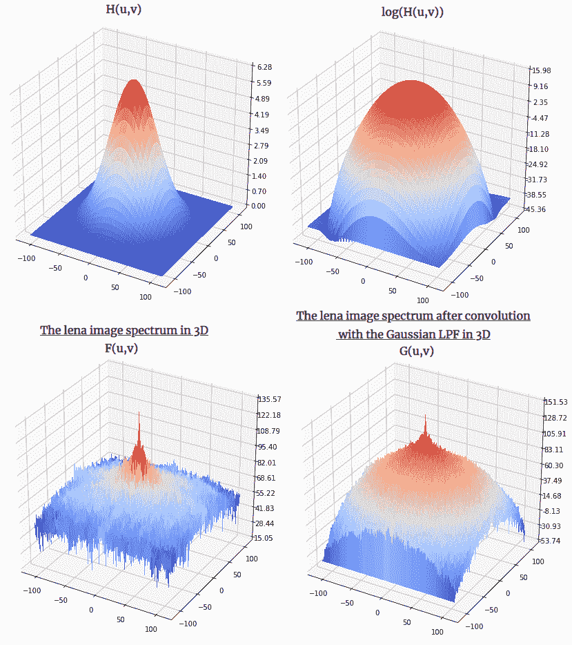 在本节中,我们将在二维和三维绘图中看到高斯核在频域中的样子。