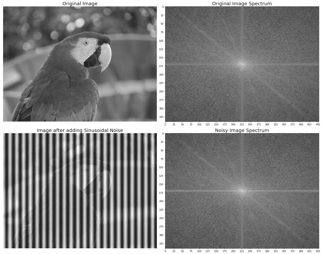 下面的屏幕截图显示了前面代码块的输出。可以看出,在 u=175 附近的频谱中,水平线上的周期性噪声变得更加突出:
