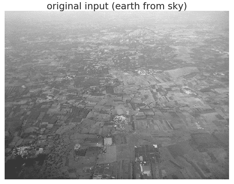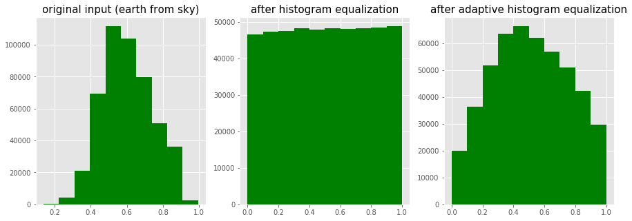 titles = ['original input (earth from sky)', 'after histogram equalization', 'after adaptive histogram equalization']