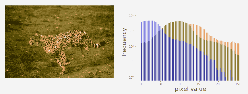 下面的屏幕截图显示了上一个代码块的输出。可以看出,输入的猎豹图像是低对比度图像,因为颜色通道直方图集中在特定的值范围内(右偏),而不是分布在所有可能的像素值上: