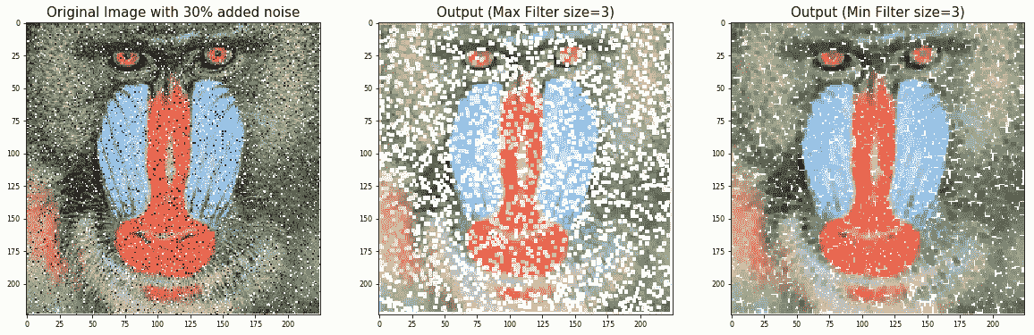 下面的屏幕截图显示了上一个代码块的输出。可以看出,最大和最小滤波器分别在去除噪声图像中的椒盐噪声方面有一定的效果: