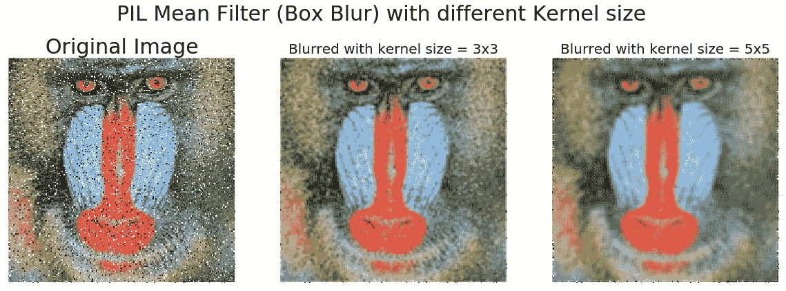 下面的代码块显示了如何使用 PILImageFilter.Kernel()函数和大小为 3 x 3 和 5 x 5 的框模糊核(平均滤波器)平滑带噪图像: