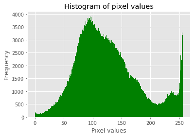 pylab.xlabel('Pixel values'), pylab.ylabel('Frequency'),