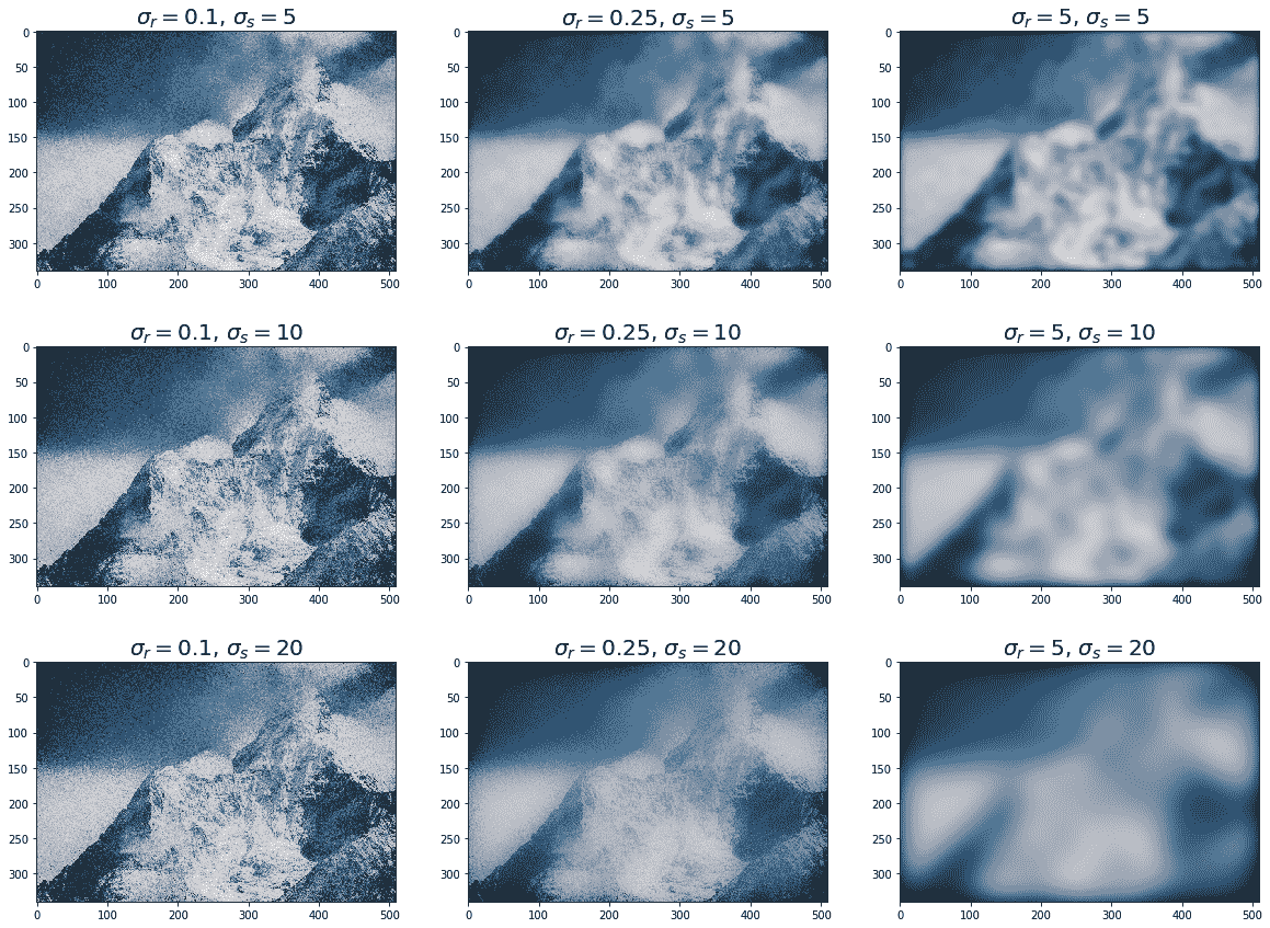 下面的代码块演示了如何使用双边滤波器对先前的噪声图像进行去噪,参数σ颜色和σ空间的值不同: