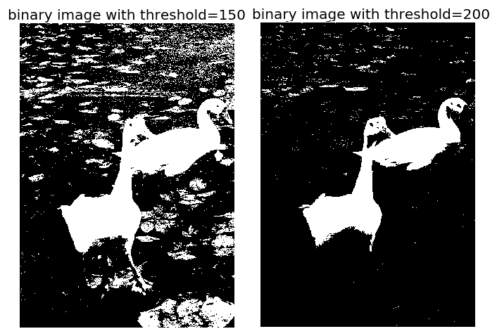 pylab.subplot(2,2,i), plot_image(im1, 'binary image with threshold=' + str(th[i]))