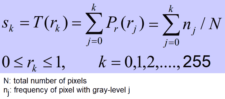 直方图均衡化使用单调和非线性映射,该映射重新分配输入图像中的像素强度值,使得输出图像具有均匀的强度分布(平坦直方图),从而增强图像的对比度。下面的屏幕截图描述了直方图均衡化的转换函数: