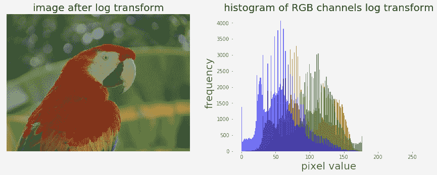 现在,让我们使用 PIL 图像模块的point()功能应用对数变换,并对 RGB 图像不同颜色通道直方图的变换产生影响: