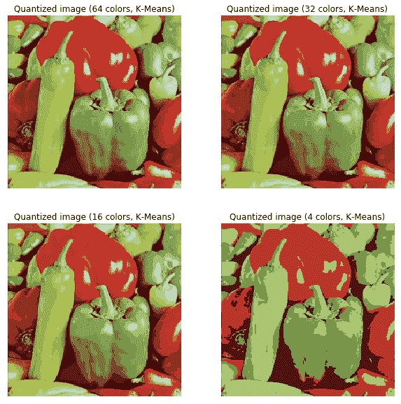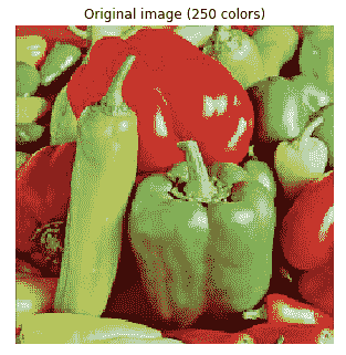 在本节中,我们将演示如何对 pepper 图像执行像素级矢量量化VQ),将显示图像所需的颜色数量从 250 种唯一颜色减少到 4 种颜色,同时保持整体外观质量。在本例中,像素在三维空间中表示,k-均值用于查找四个颜色簇。