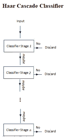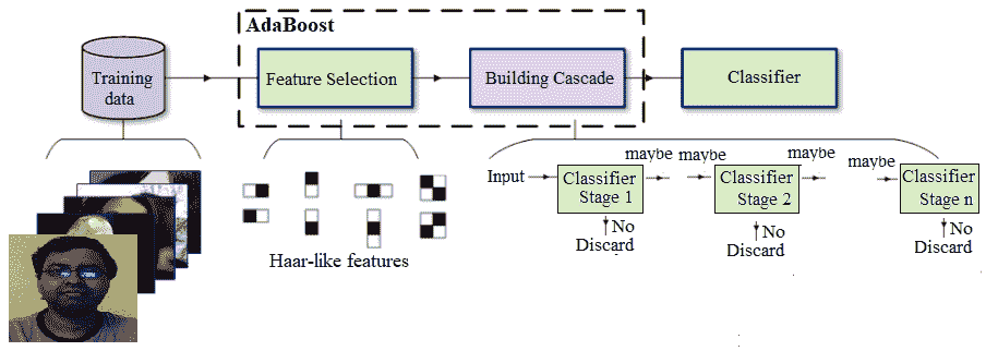 不是在一个窗口上应用所有 6000 个特征,而是通过使用 AdaBoost 集成分类器将特征分组到弱分类器的不同阶段(以执行特征级联性能的自适应增强),并且这些弱分类器在级联中逐个运行。如果正在考虑的修补程序窗口在任何阶段失败,则该窗口将被拒绝。通过所有阶段的修补程序被视为有效检测
