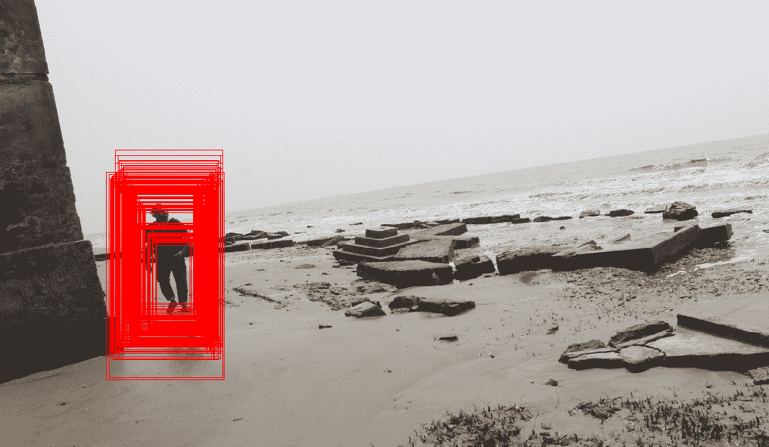以下屏幕截图显示了输出、图像以及边界框(红色矩形)指示的不同比例的检测对象: