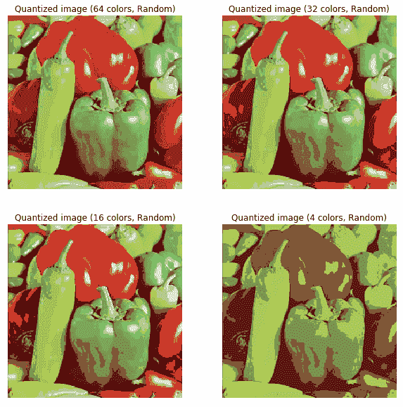 在图像处理文献中,码本是从 k-means(聚类中心)获得的,称为调色板。在调色板中,使用单个字节,最多可以寻址 256 种颜色,而 RGB 编码需要每个像素 3 个字节。GIF 文件格式使用这样的调色板。为了进行比较,我们还将看到使用随机码本(随机拾取的颜色)的量化图像。