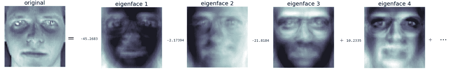 这可以用于(线性)降维(大多数时候只有少数主要主成分捕获数据集中几乎所有的方差)和具有多个维度的数据集的可视化(2D)。PCA 的一个应用是特征面,以找到一组可以(理论上)表示任何面(作为这些特征面的线性组合)的面。